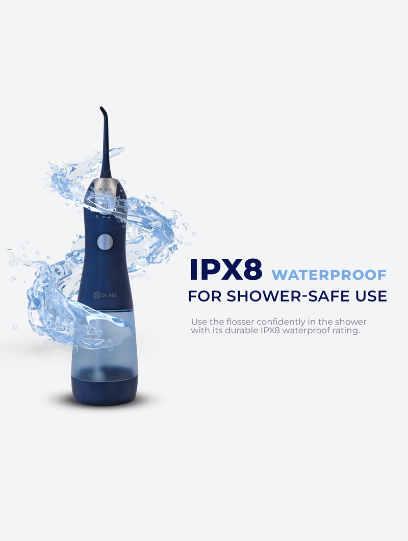 The Dr. Aid Water Flosser simplifies oral care with 5 tips for teeth, gums, braces and tongue. Water flosser operates in 3 modes - Standard, Soft, and Pulse. This water flosser cordless design allows for easy use at home or on the go. Being IPX8 waterproof, it’s safe to use in the shower, making it a perfect portable water flosser for those seeking a cordless water flosser that combines convenience and powerful performance. This Dr. Aid water flosser flosser offers high pressure water pulse of 1800 times/min and generates 0.6mm High frequency pulse water column to be precise and effective dental water flosser.