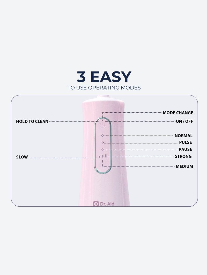 The Dr. Aid Water Flosser delivers professional-level oral care with maximum convenience. Designed for everyday use at home or on the go, it combines power, precision, and comfort in one sleek device. Featuring a 12 oz water tank, 5 interchangeable tips, and 3 operation modes, it provides a deep, thorough clean for teeth, gums, braces, and hard-to-reach areas.