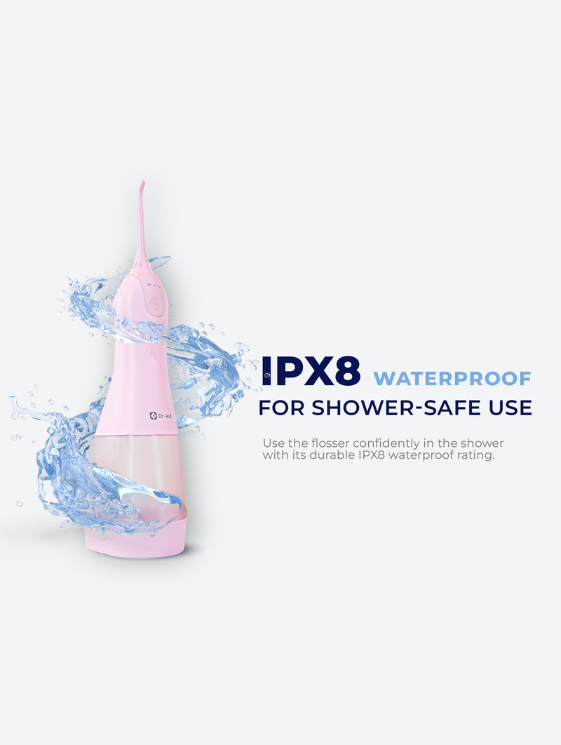 The Dr. Aid Water Flosser simplifies oral care with 5 tips for teeth, gums, braces and tongue. Water flosser operates in 3 modes - Standard, Soft, and Pulse. This water flosser cordless design allows for easy use at home or on the go. Being IPX8 waterproof, it’s safe to use in the shower, making it a perfect portable water flosser for those seeking a cordless water flosser that combines convenience and powerful performance. This Dr. Aid water flosser flosser offers high pressure water pulse of 1800 times/min and generates 0.6mm High frequency pulse water column to be precise and effective dental water flosser.
