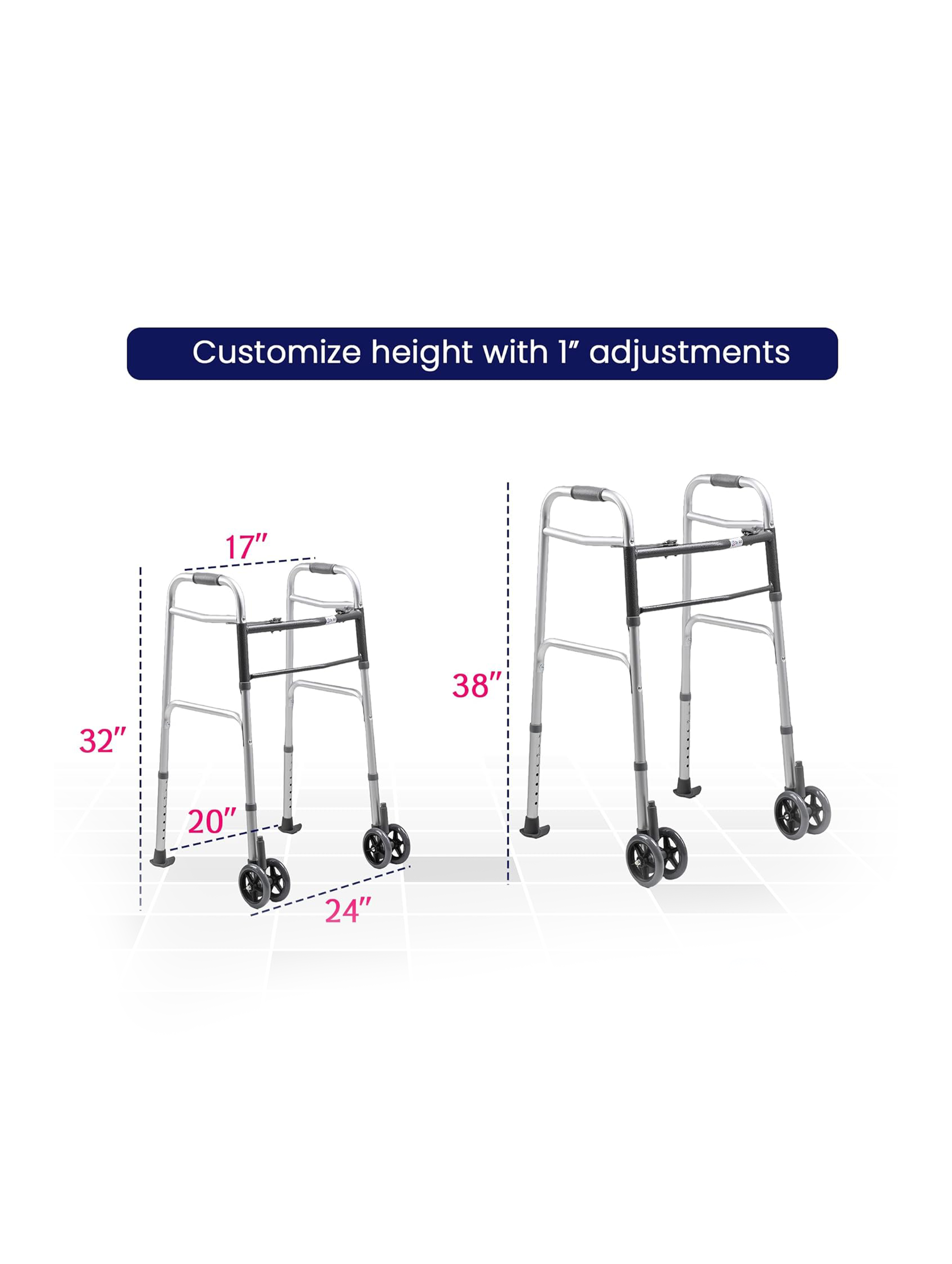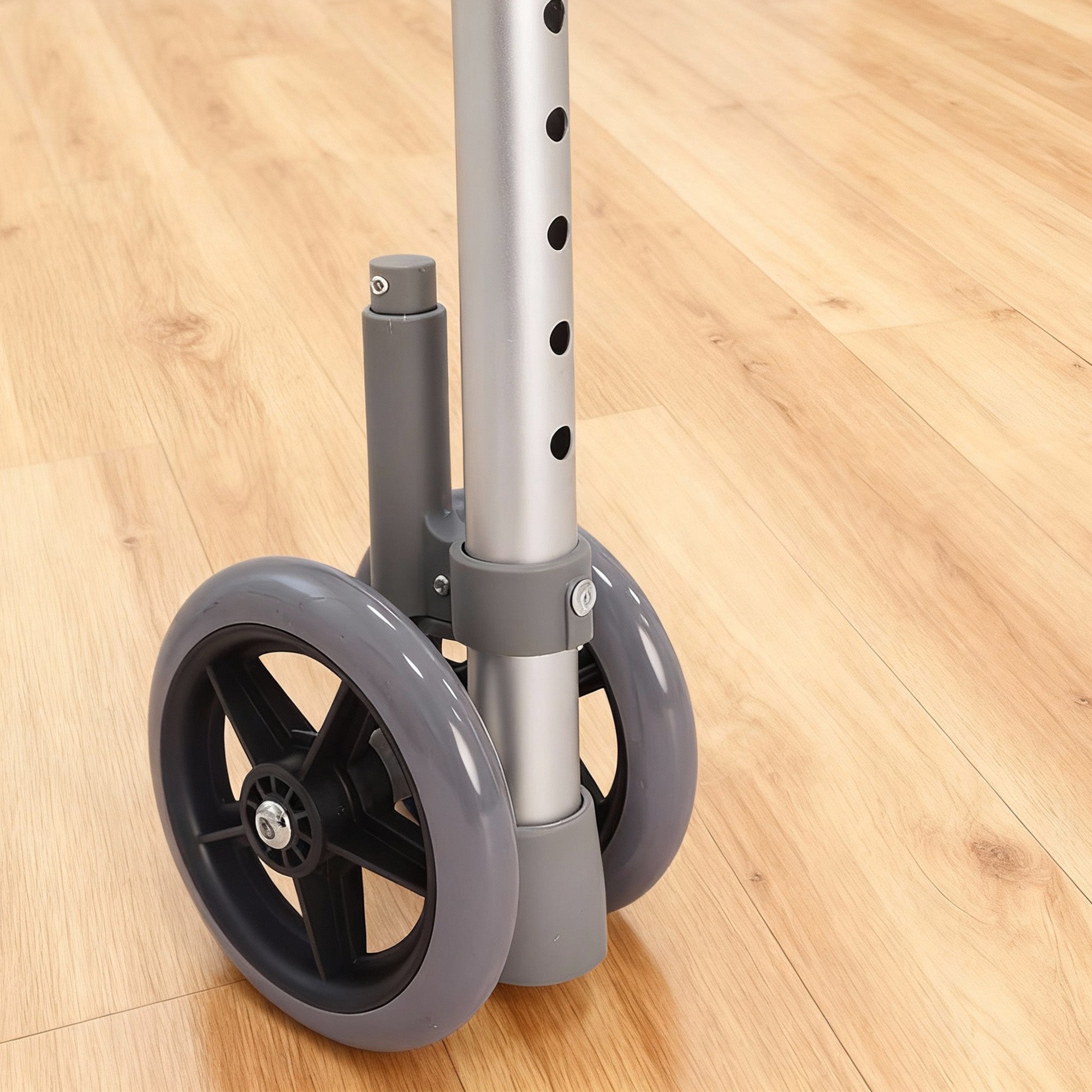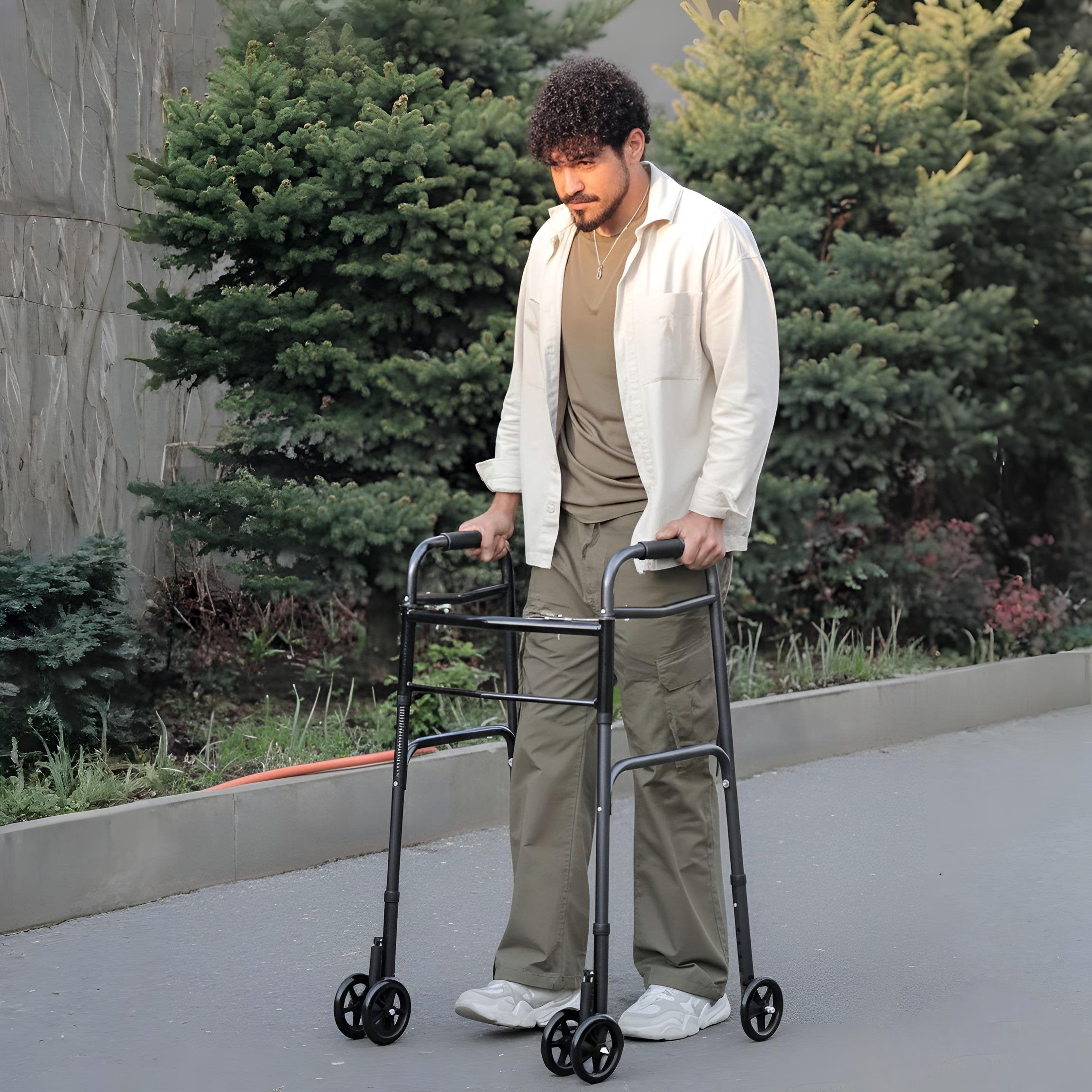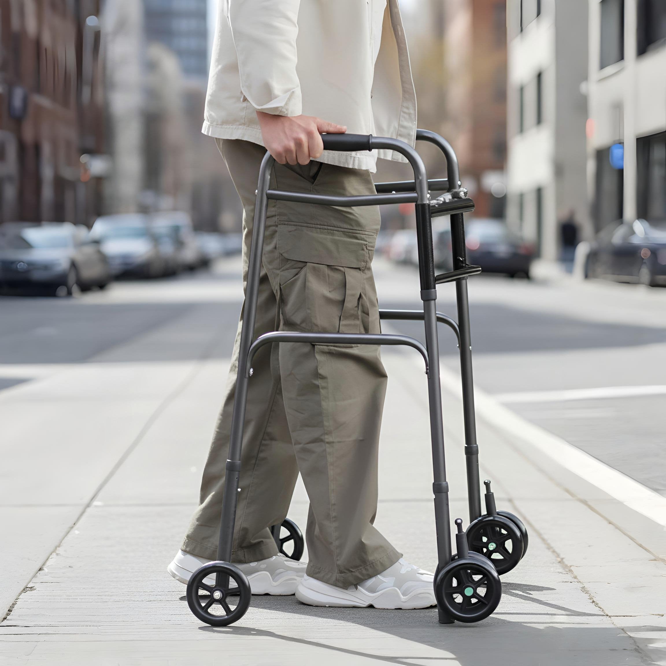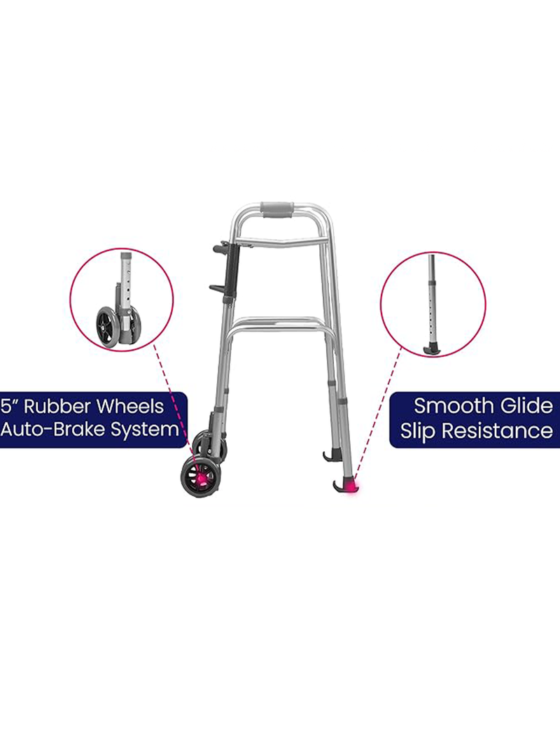 With eight adjustable height settings, it adapts to different users for proper posture and comfort. It functions as both a standard and two-wheel walker, offering flexibility for various needs. The auto brake system ensures secure stops and control on slopes and uneven terrain. Durable, portable, and reliable, this walker is built for everyday indoor and outdoor use.