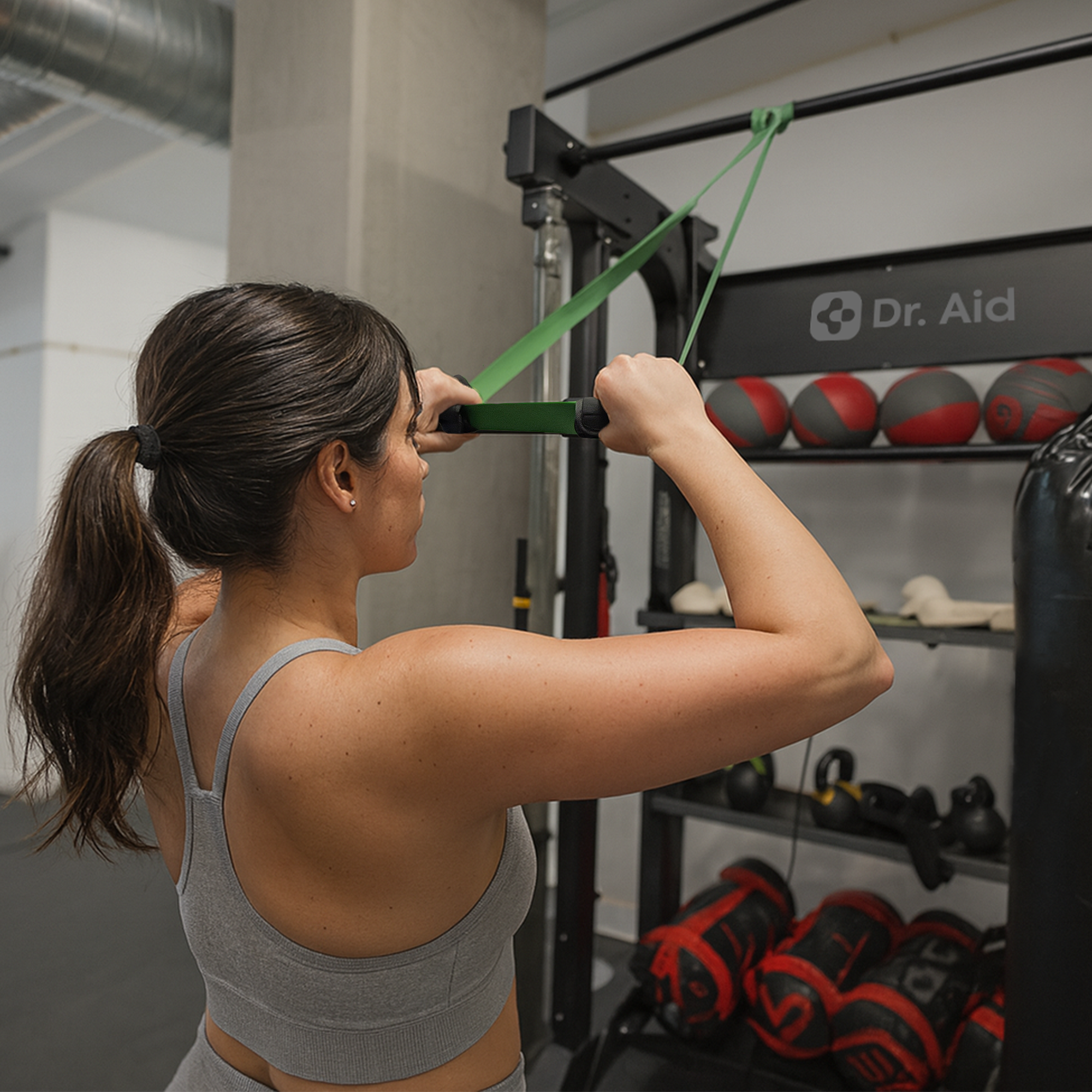 The dual handles let you switch quickly between movements or set up two bands at once for heavier resistance—ideal for strength circuits and partner workouts.