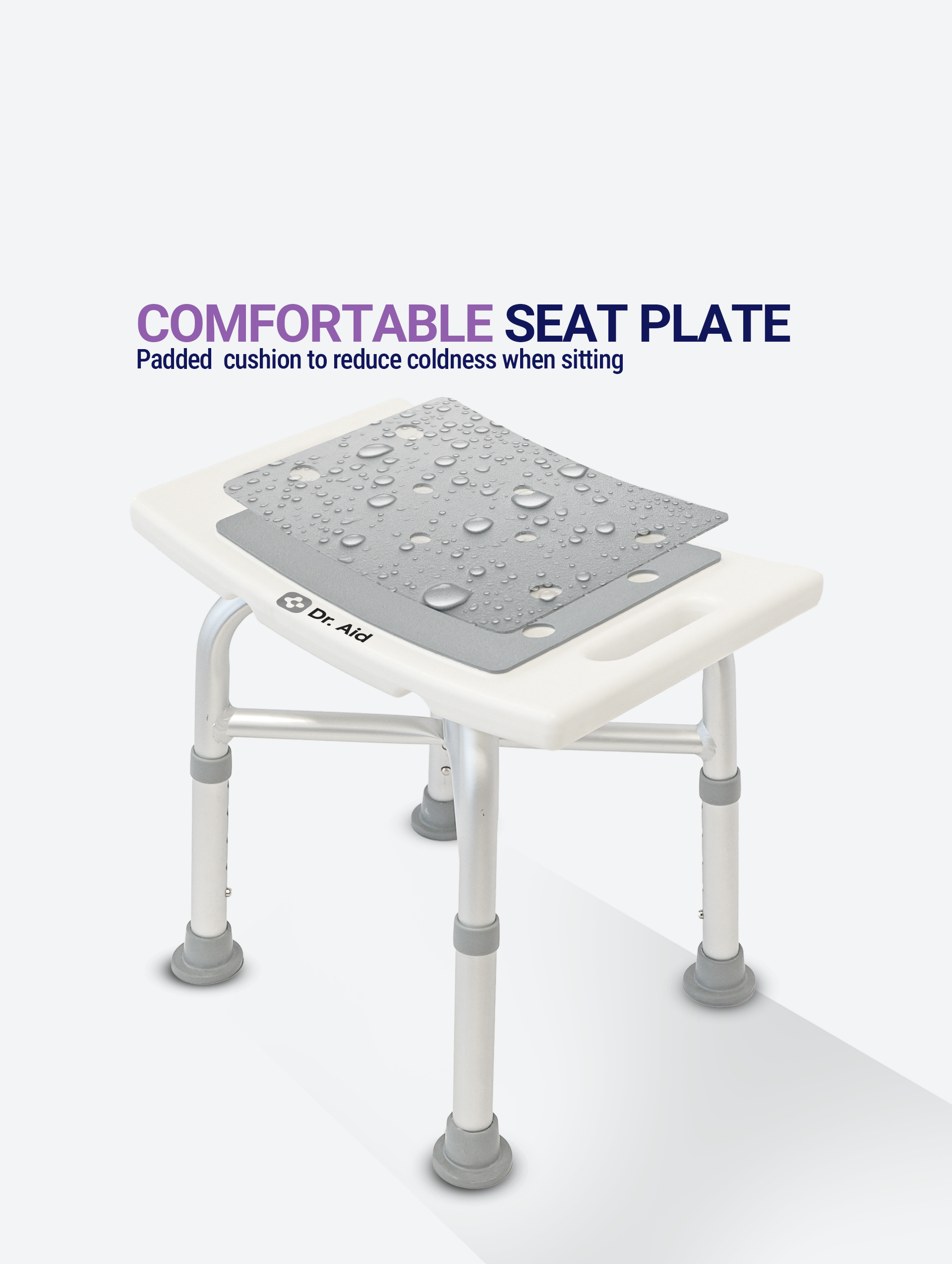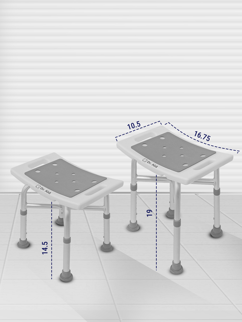 The wide, contoured seat gives you a secure, relaxing experience, while anti-slip rubber feet prevent movement on wet floors. With five adjustable height levels (14.5–19), you can tailor the seat to your comfort and shower setup. Assembly is effortless — no tools or screws required. With clearly marked parts and a simple step-by-step guide, setup takes just 3 minutes, making it ideal for at-home use or quick travel assembly. Compact but strong, the Dr. Aid Shower Stool fits perfectly in smaller showers or tubs and features a built-in carrying handle and showerhead holder for convenience. Whether you’re supporting a loved one or simply want a safer, more stable bathing experience, Dr. Aid brings confidence and comfort to every shower.