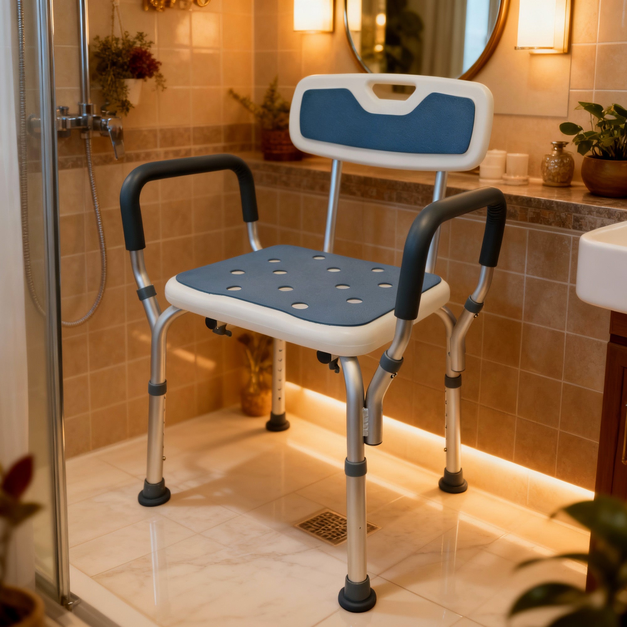 Designed with both comfort and stability in mind, this chair gives you the support you need without taking away your independence. Made from durable, rust-proof aluminum, it’s sturdy enough to hold up to 400 lbs, yet light and easy to move around. For daily long-term use, a weight of up to 220 lbs is recommended to keep it performing at its best. The padded armrests and backrest add comfort and make it easier to get in and out of the seat, while non-slip rubber feet provide a solid grip on wet floors.