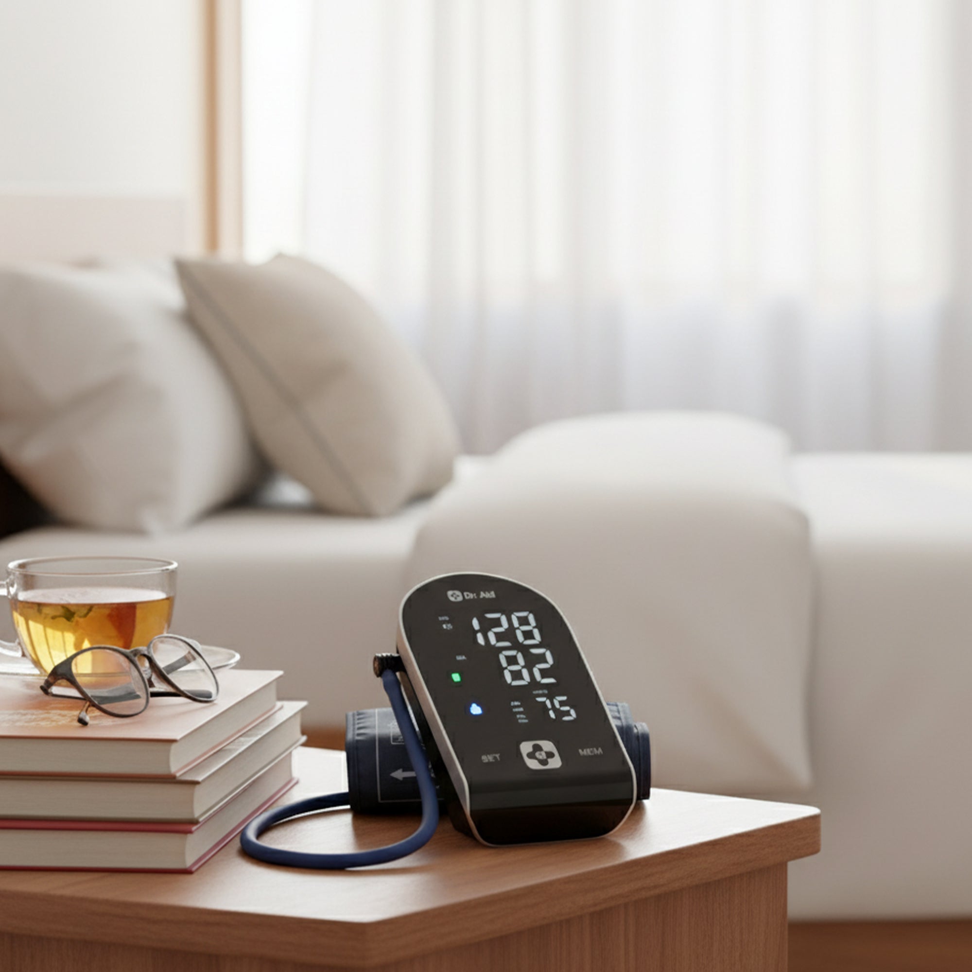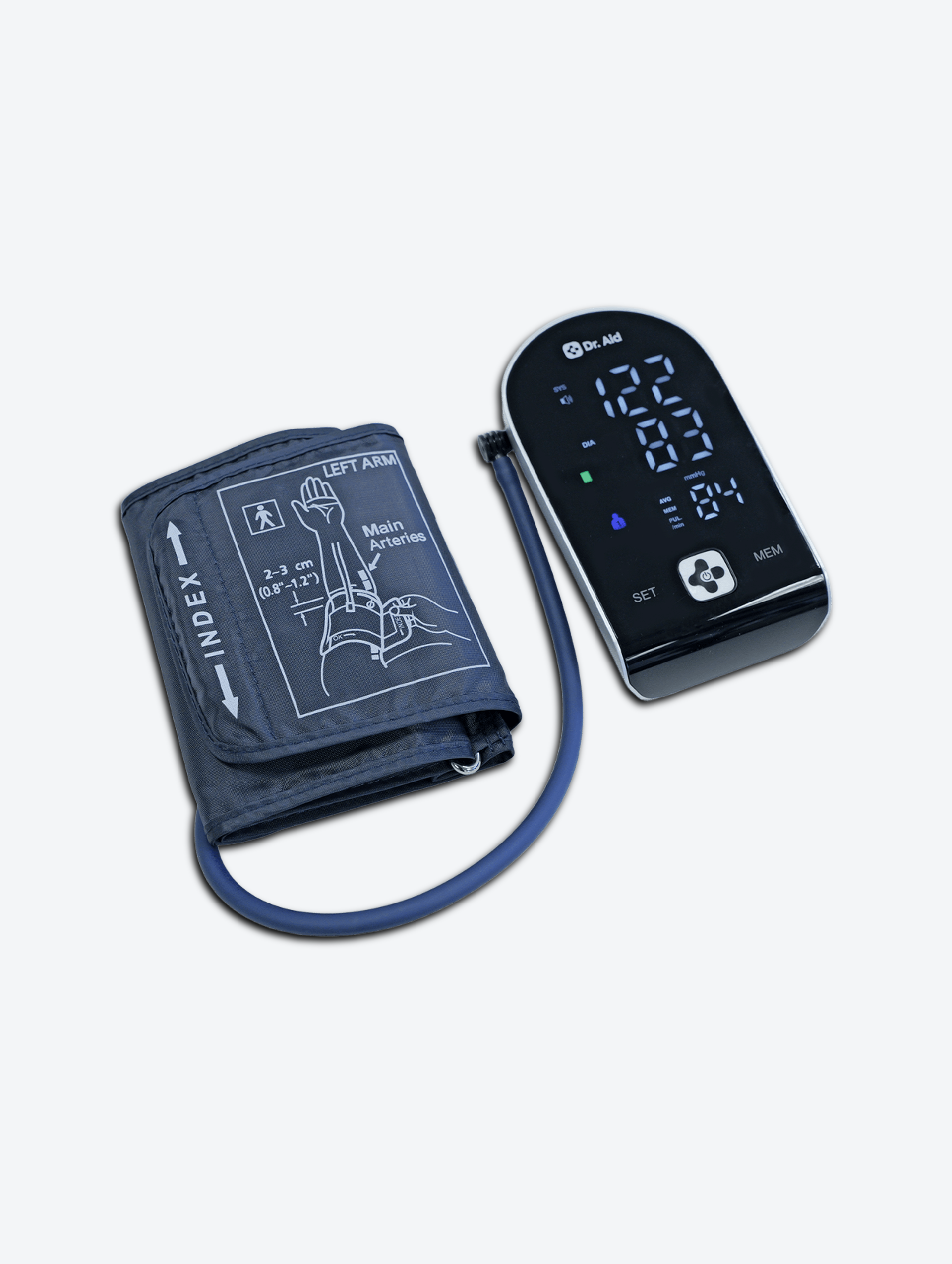 The Dr. Aid Blood Pressure Monitor combines dependable performance with a user-friendly layout for easy at-home use. Using advanced oscillometric technology, it provides consistent results within a range of 30–280 mmHg with ±3 mmHg precision, and pulse detection from 40–199 bpm with ±5% tolerance. The extra-large LED display with optional voice prompts makes all information simple to view and understand, even in low-light environments. With one-touch operation, this unit offers quick and effortless functionality suitable for users of all ages.