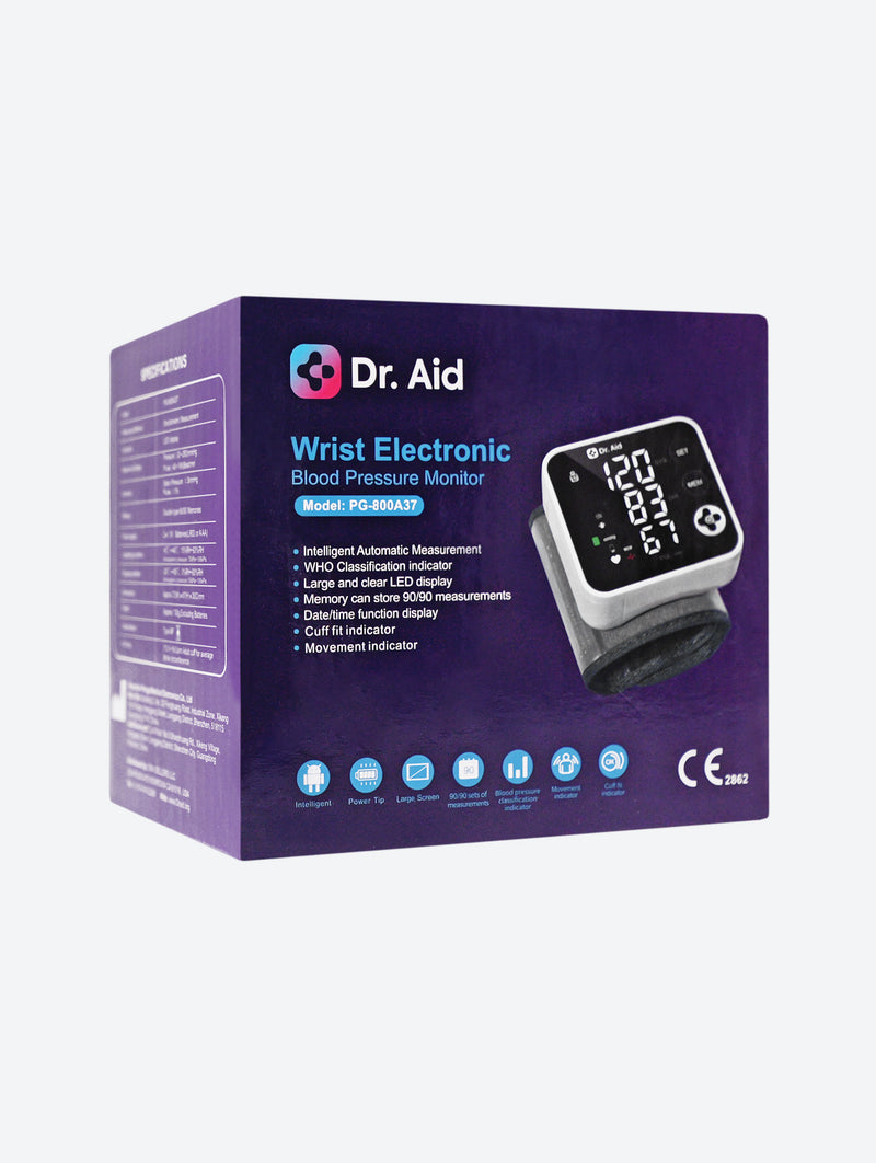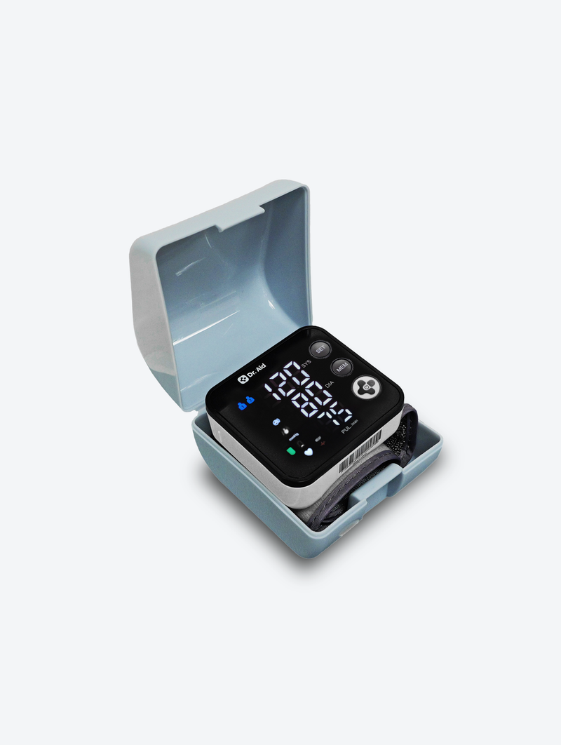 The built-in WHO hypertension indicator, along with movement and cuff-fit sensors, guides users toward more accurate and consistent results. Designed for both comfort and convenience, the adjustable 13.5–19.5 cm wrist cuff fits most adults securely. Lightweight (approx. 130 g excluding batteries) and powered by 2×AAA batteries, it’s perfect for home or travel use.Compact, easy to operate, and clinically precise — the Dr. Aid Wrist Blood Pressure Monitor makes managing your health simple, smart, and stress-free.