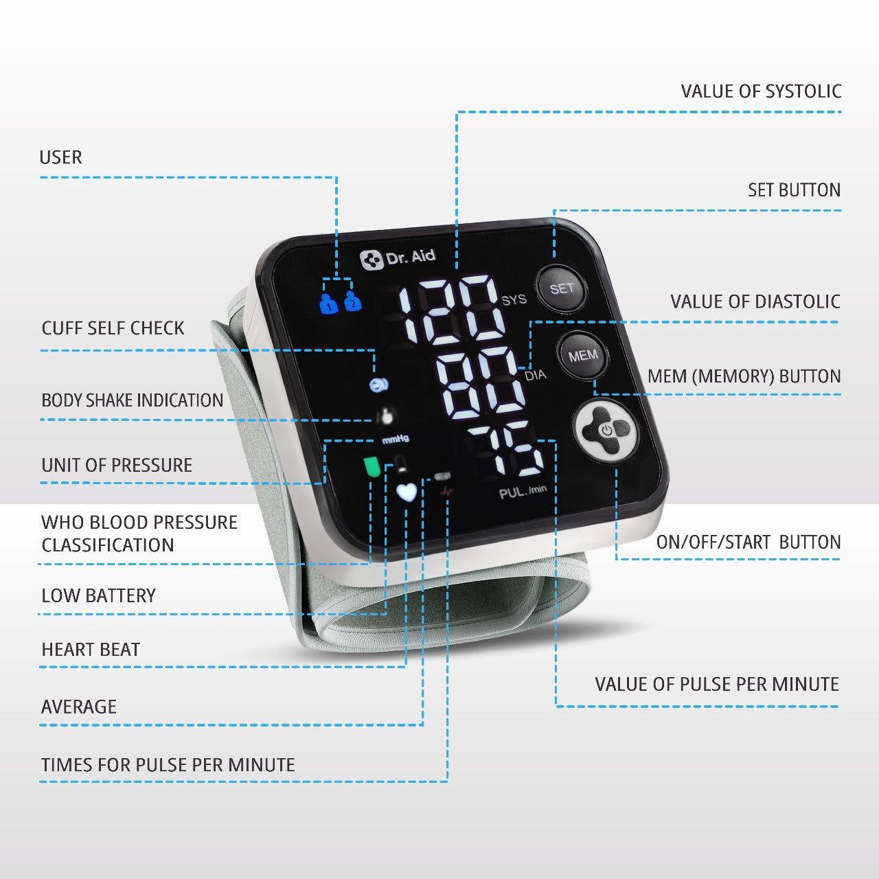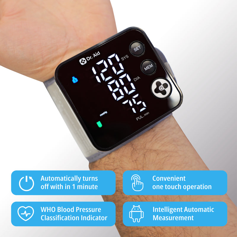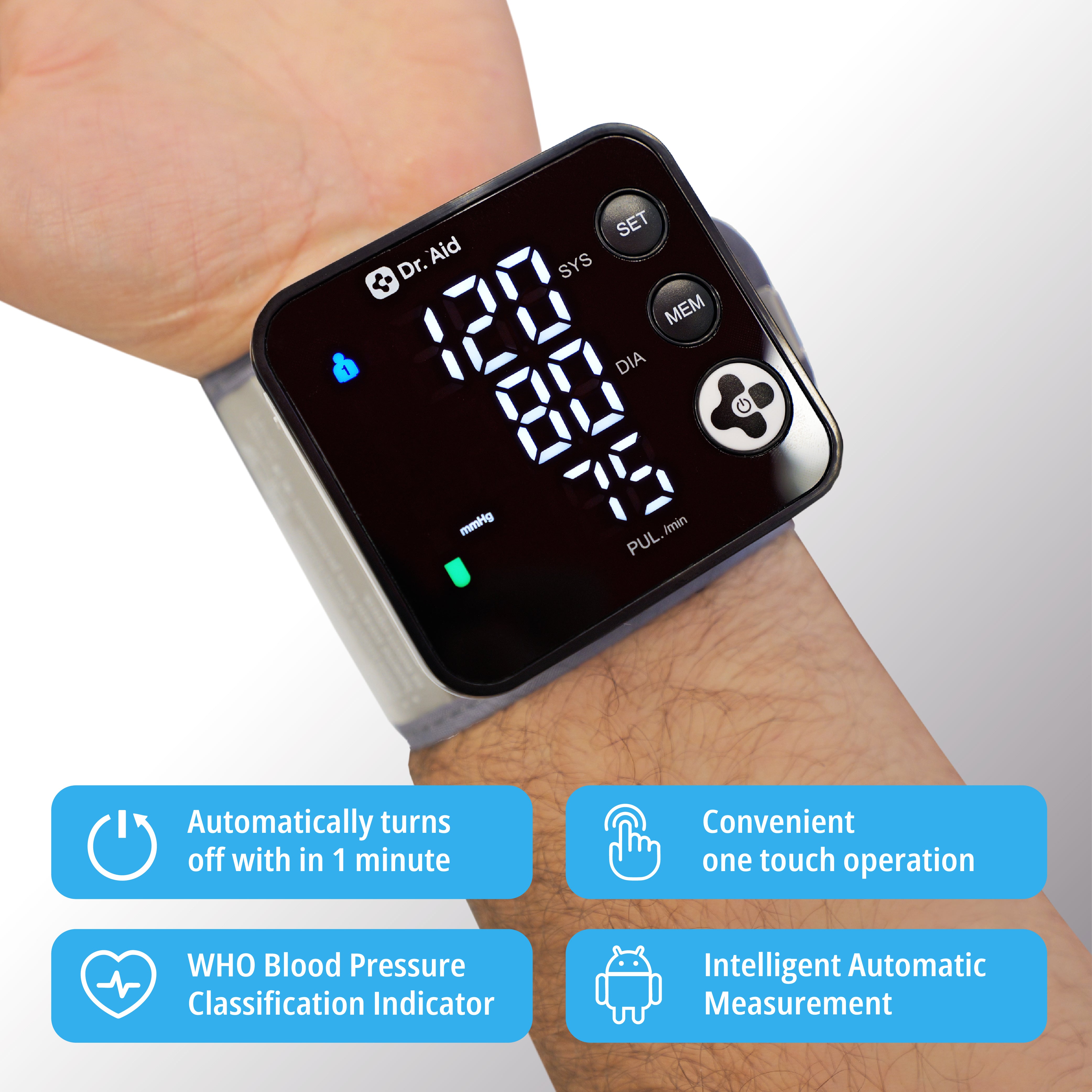 The Dr. Aid Wrist Blood Pressure Monitor combines precision, comfort, and smart functionality for effortless health tracking. Using advanced oscillometric technology, it provides fast and reliable readings with a single touch. The extra-large LED screen displays clear results, while one-button operation makes it simple for anyone to use — from busy professionals to seniors. Engineered for accuracy, the monitor measures 30–280 mmHg pressure and 40–199 bpm pulse rate, maintaining consistent precision with ±3 mmHg and ±5% accuracy levels. Its dual-user memory function stores up to 180 total readings, helping you and a loved one monitor long-term blood pressure trends with ease.