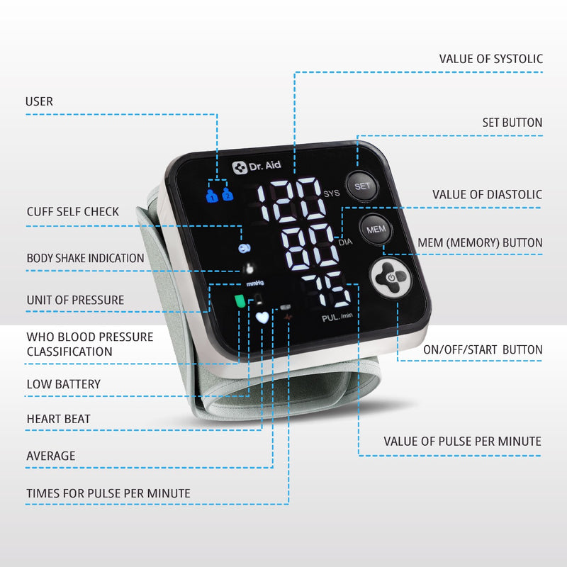 The built-in WHO hypertension indicator, along with movement and cuff-fit sensors, guides users toward more accurate and consistent results. Designed for both comfort and convenience, the adjustable 13.5–19.5 cm wrist cuff fits most adults securely. Lightweight (approx. 130 g excluding batteries) and powered by 2×AAA batteries, it’s perfect for home or travel use.Compact, easy to operate, and clinically precise — the Dr. Aid Wrist Blood Pressure Monitor makes managing your health simple, smart, and stress-free.
